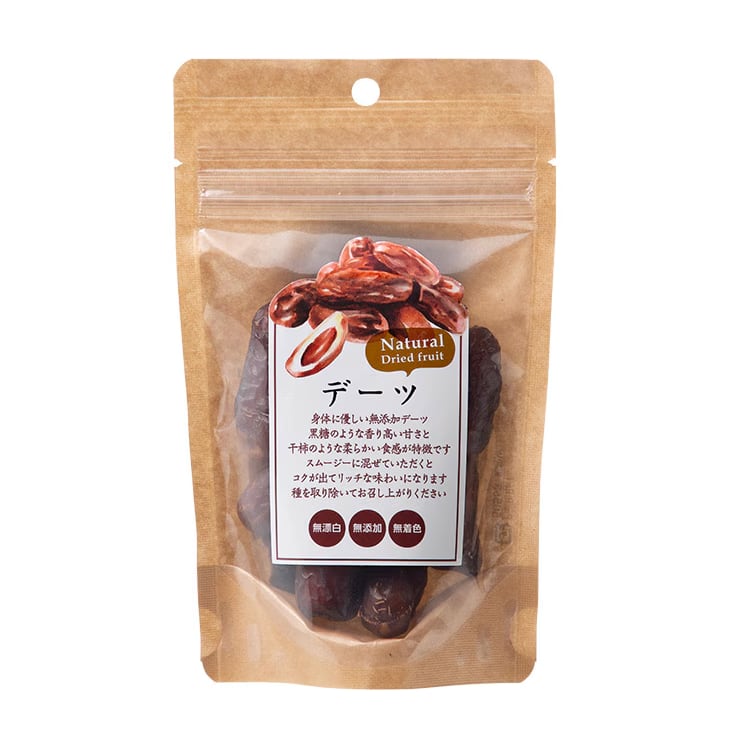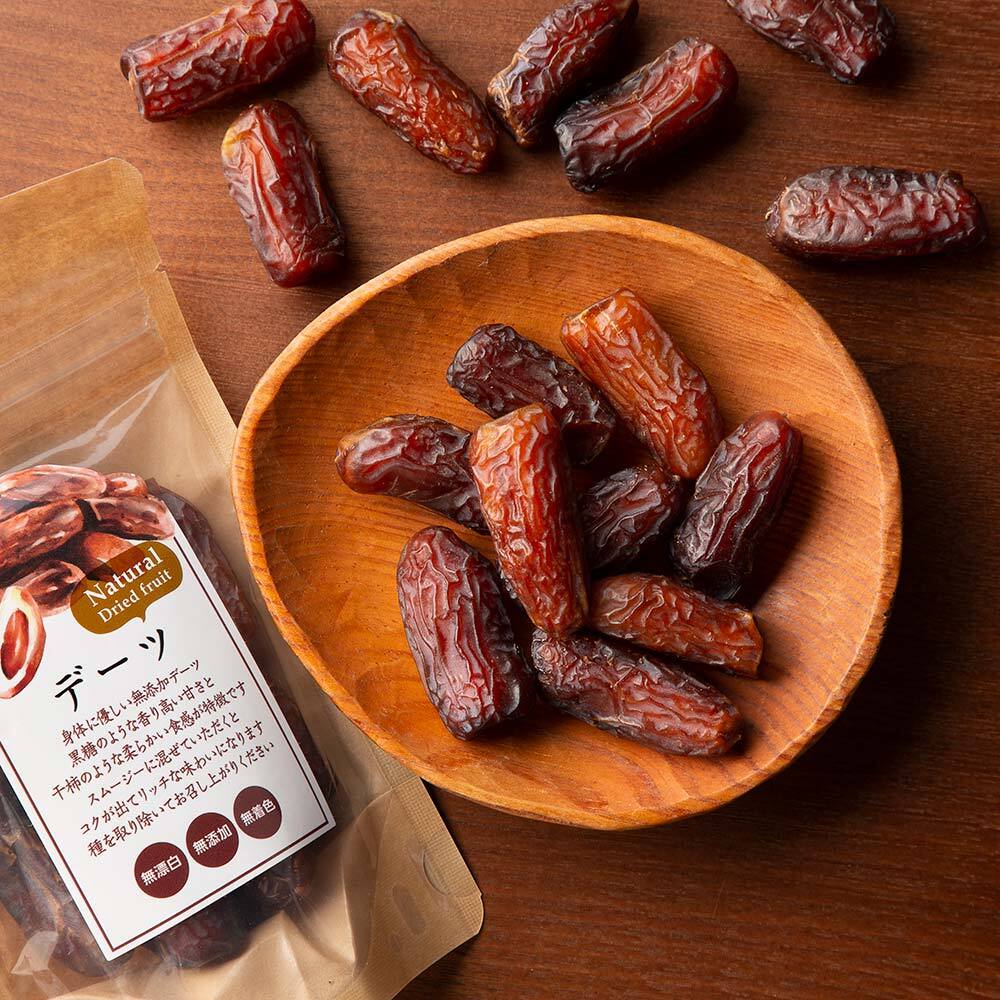 注意いただきたいのは、砂糖不使用でもドライフルーツには多くの果糖が含まれていますので、デーツやいちじくなら1日2粒~3粒を目安に召し上がってください。